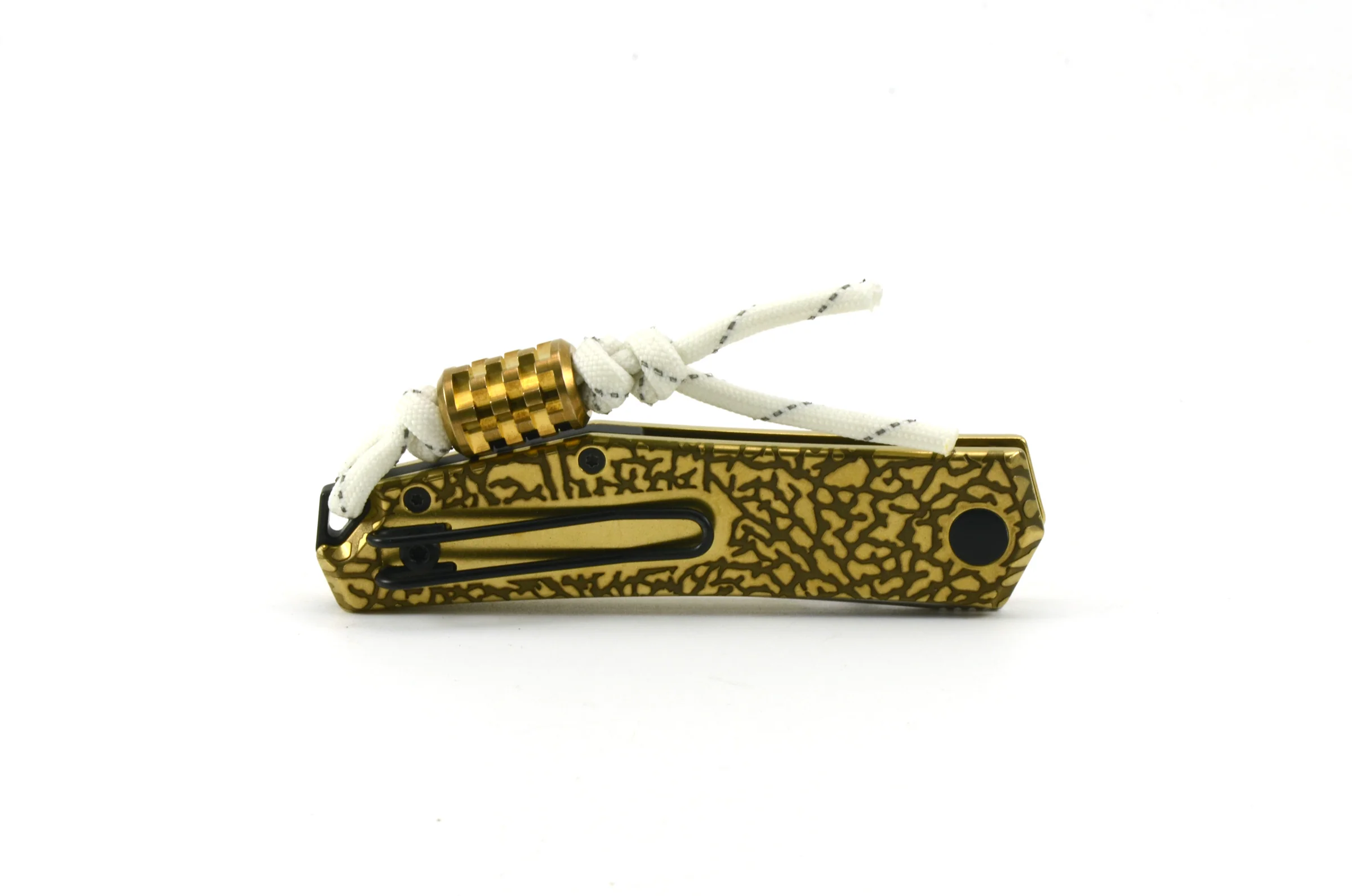 - Laser Engraving: The knife is fully disassembled and each scale is lasered separately with an Elephant Skin pattern created by Joe Wu of Scout Leather Co. Two final engraving passes darken the low areas of the engraving to enhance contrast. The Prometheus logo is also etched along side the GM markings on the blade. Also take special note of the blank area beneath the clip so the texture won't destroy your pockets. I take the same approach on all flashlights I design. Your tools shouldn't ruin your other gear.